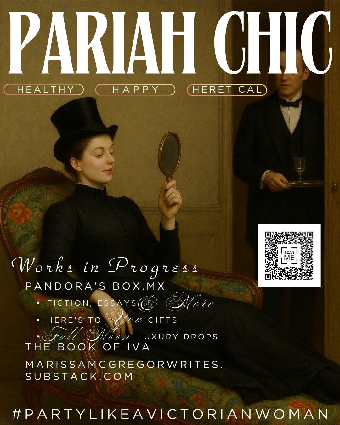 Marissa McGregor is the creator of Pariah Chic, a slow-burn lifestyle brand reclaiming what others tried to break. She’s curating Evenings in a Bag and Naughty Gift Bags (among other things)—and developing a product line featuring fermented foods, botanicals, and other forms of spicy goodness. Her work is rooted in survival, resistance, joy… and just a touch of vengeance. 😘